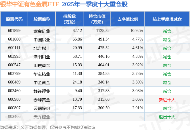 从基金规模来看,银华中证有色金属ETF基金2025年一季度公布的基金规模为1.03亿元,较上一期规模1.28亿元变化了-2473.73万元,环比变化了-19.35%。该基金最新一期资产配置为:股票占净值比98.42%,无债券类资产,现金占净值比2.19%。从基金持仓来看,该基金当季前十大股票仓位达44.63%,第一大重仓股为紫金矿业(601899),持仓占比为10.92%。
