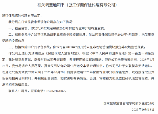 10月14日金融一线消息粤友钱配资,国家金融监督管理总局丽水监管分局10月13日发布的相关调查通知书(浙江保鼎保险代理有限公司)显示,截至目前,浙江保鼎保险代理有限公司未按规定缴纳2025年保险专业中介机构监管费;公司责任保险已于2025年4月到期,未发现登记新的投保信息;公司自2025年2月开始未在非现场管理模块报送非现场监管报表。调查通知书按程序通过邮政寄送,但公司未签收被退回。9月28日,丽水监管分局调查人员又到达公司住所送交调查通知书,公司已处于失联状态无法送达。